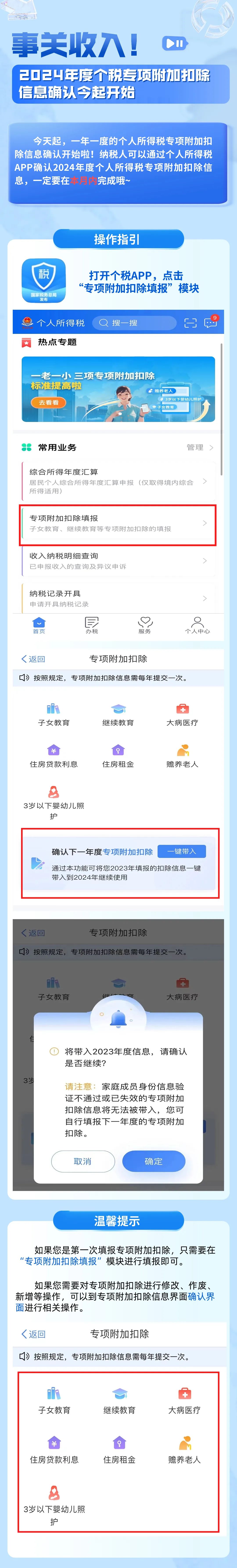 今天起,一年一度的個(gè)人所得稅專(zhuān)項附加扣除信息確認開(kāi)始啦!納稅人可以通過(guò)個(gè)人所得稅APP確認2024年度個(gè)人所得稅專(zhuān)項附加扣除信息,一定要在本月內完成哦~