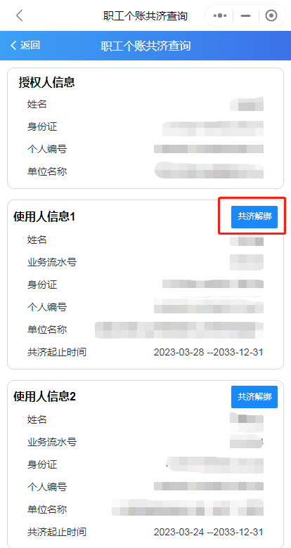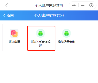 第四步:辦理完成后,可通過(guò)“家庭共濟”——“共濟關(guān)系查詢(xún)解綁”查詢(xún)綁定情況,“解除綁定”功能也可在此界面操作。