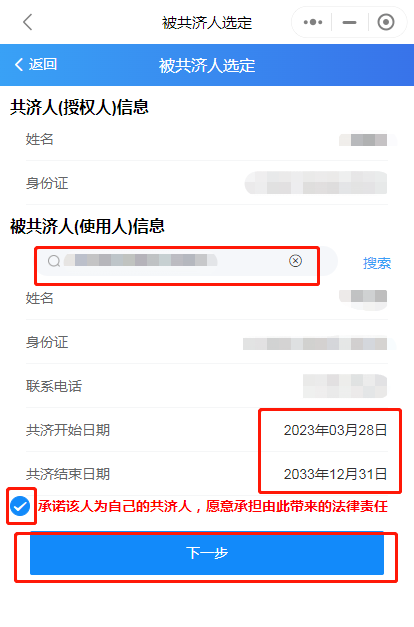 第三步:輸入被綁定人身份證號,選擇共濟時(shí)間,勾選承諾,點(diǎn)擊下一步,綁定成功。