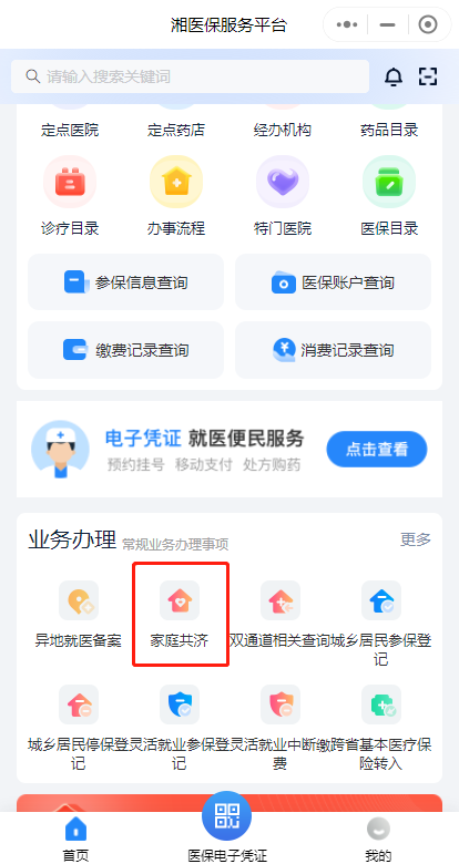 第一步:下載“湘醫?!盇pp,或進(jìn)入“湘醫?!盇pp小程序,登錄后在首頁(yè)“業(yè)務(wù)辦理”中找到“家庭共濟”,點(diǎn)擊“共濟申請”。