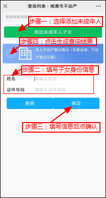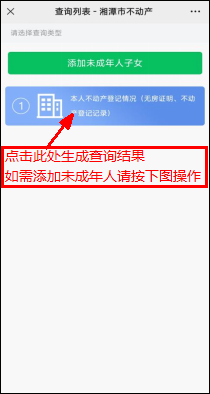 ⑸. 如需添加未成年人請點(diǎn)擊“添加未成年子女”后輸入身份信息并點(diǎn)擊確認,再點(diǎn)擊“本人不動(dòng)產(chǎn)登記情況”
